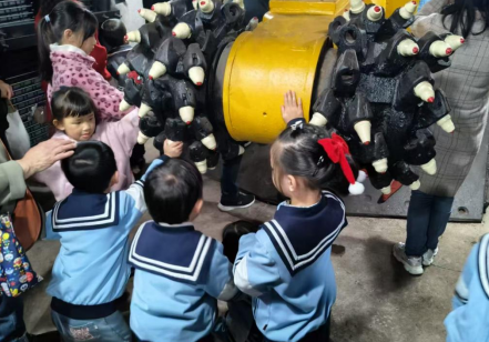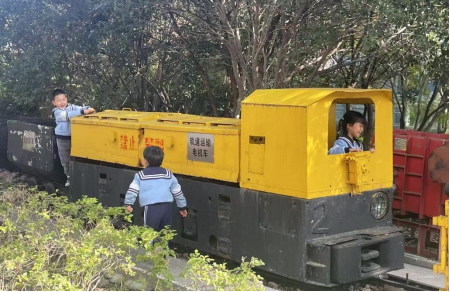 随后,小朋友们来到户外矿车展示地。面对老式矿车,大家积极触摸、观察,在老师讲解下了解矿车用途与发展历程,还排队体验模拟推车,在互动中感受煤矿生产变迁,现场满是欢声笑语。