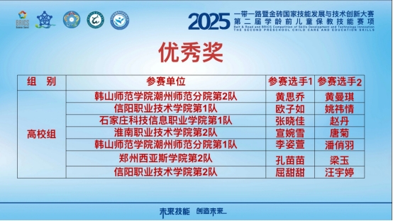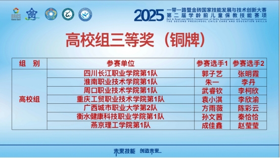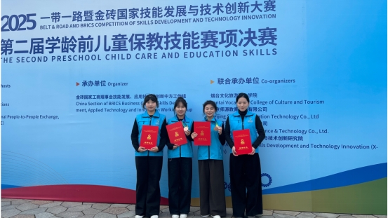2025年12月22日,2025年“一带一路暨金砖国家技能发展与技术创新大赛”第二届学龄前儿童保教技能赛项决赛在烟台文化旅游职业学院圆满落幕,人教育学院学子不负众望,一路披荆斩棘,最终荣获1项全国三等奖和1个优秀奖的好成绩。