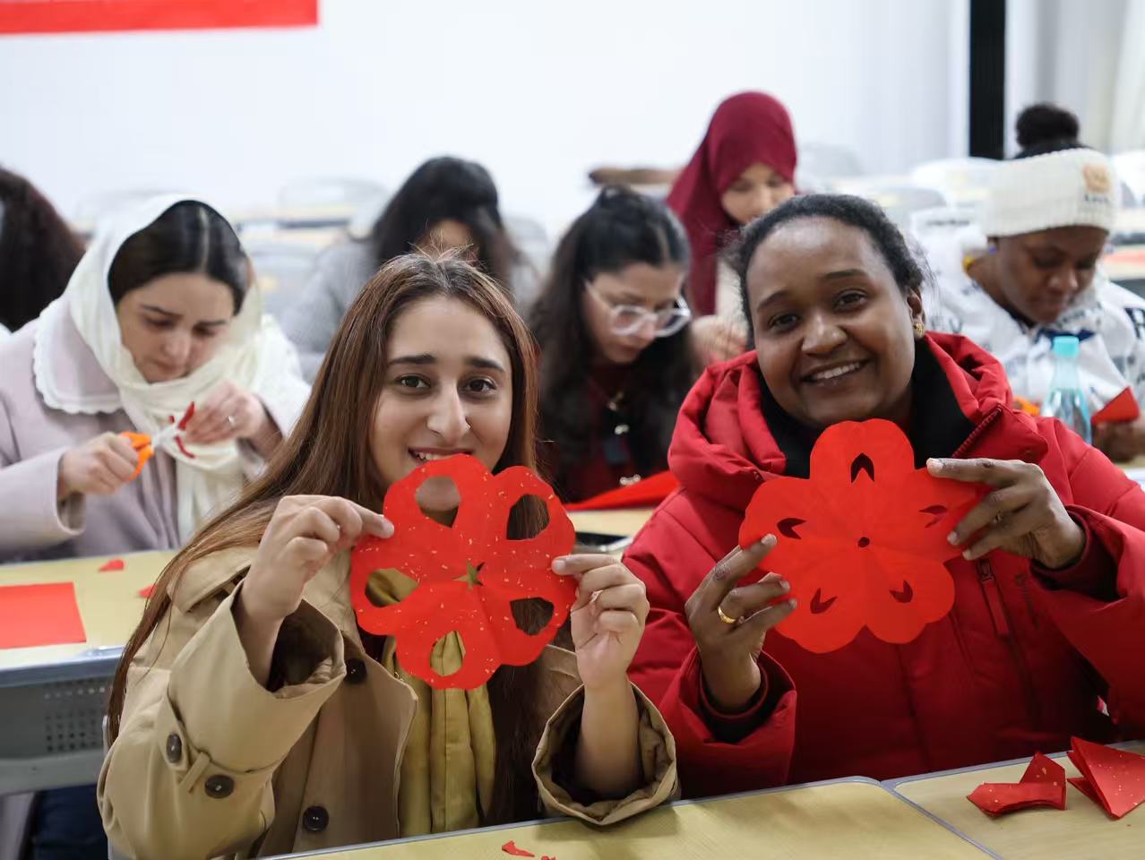 近日,受安徽理工大学国际交流处邀请,人文教育学院杨薇薇和罗璐老师赴该校参与了一场为留学生们举办了中国传统文化体验活动,进行了中华传统文化剪纸技艺的传授。此次活动以春节为契机,旨在向国际学生展示我国优秀的非物质文化遗产,促进中华传统文化的国际传播。来自全球二十多个国家的来华留学生齐聚一堂,沉浸式体验了一场丰富多彩的中华文化盛宴。