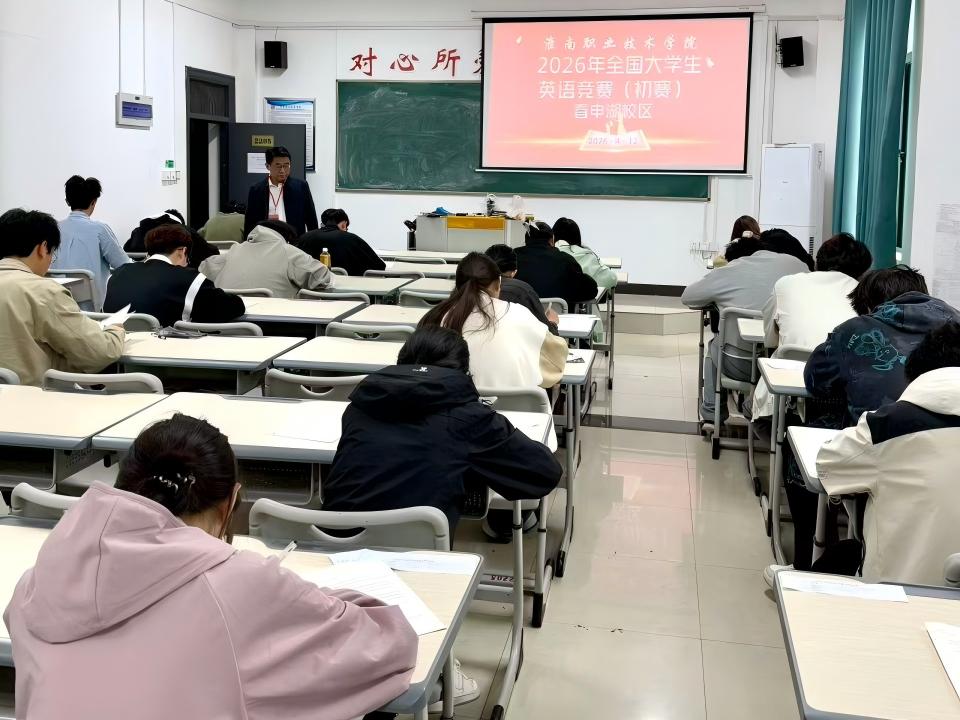 2026年4月12日,淮南职业技术学院2026年全国大学生英语竞赛(NECCS)校赛在洞山校区、春申湖校区同步顺利举行。本次竞赛由人文教育学院牵头组织,在教务处、总务处、春申湖校区综合办公室及各二级学院协同保障下,竞赛得以平稳进行。